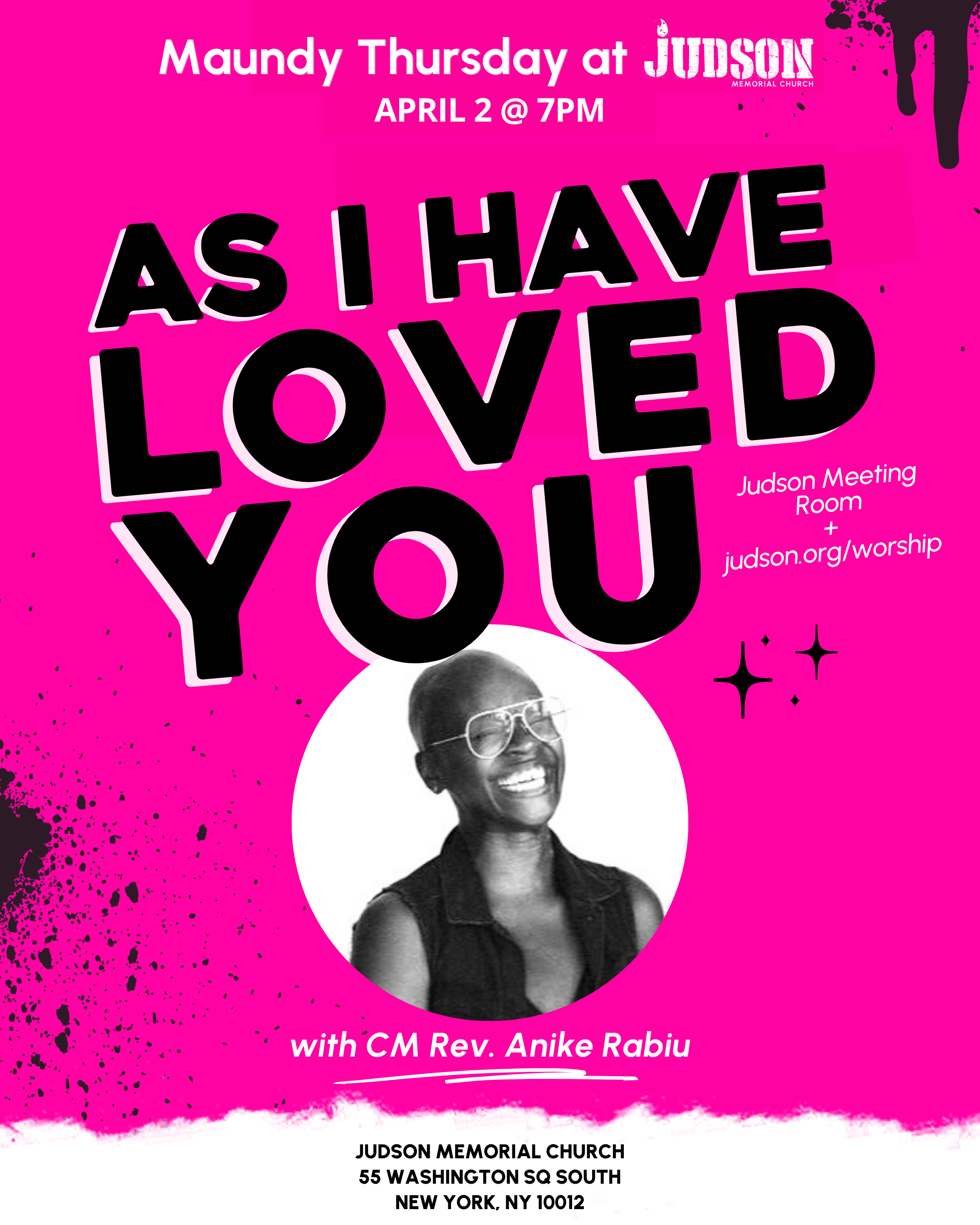 Gather at table for Judson's intimate and contemplative observance of the last meal Jesus is said to have had with his friends before Empire killed him and tried to stop their radical hope revolution. Optional footwashing will call us into the sense of service we're meant to co-create together and readings both ancient and modern, along with a message from Community Minister Rev. Anike, will remind us of the mandate that Jesus gave his friends and continues to give us, to love one another, no matter what.
