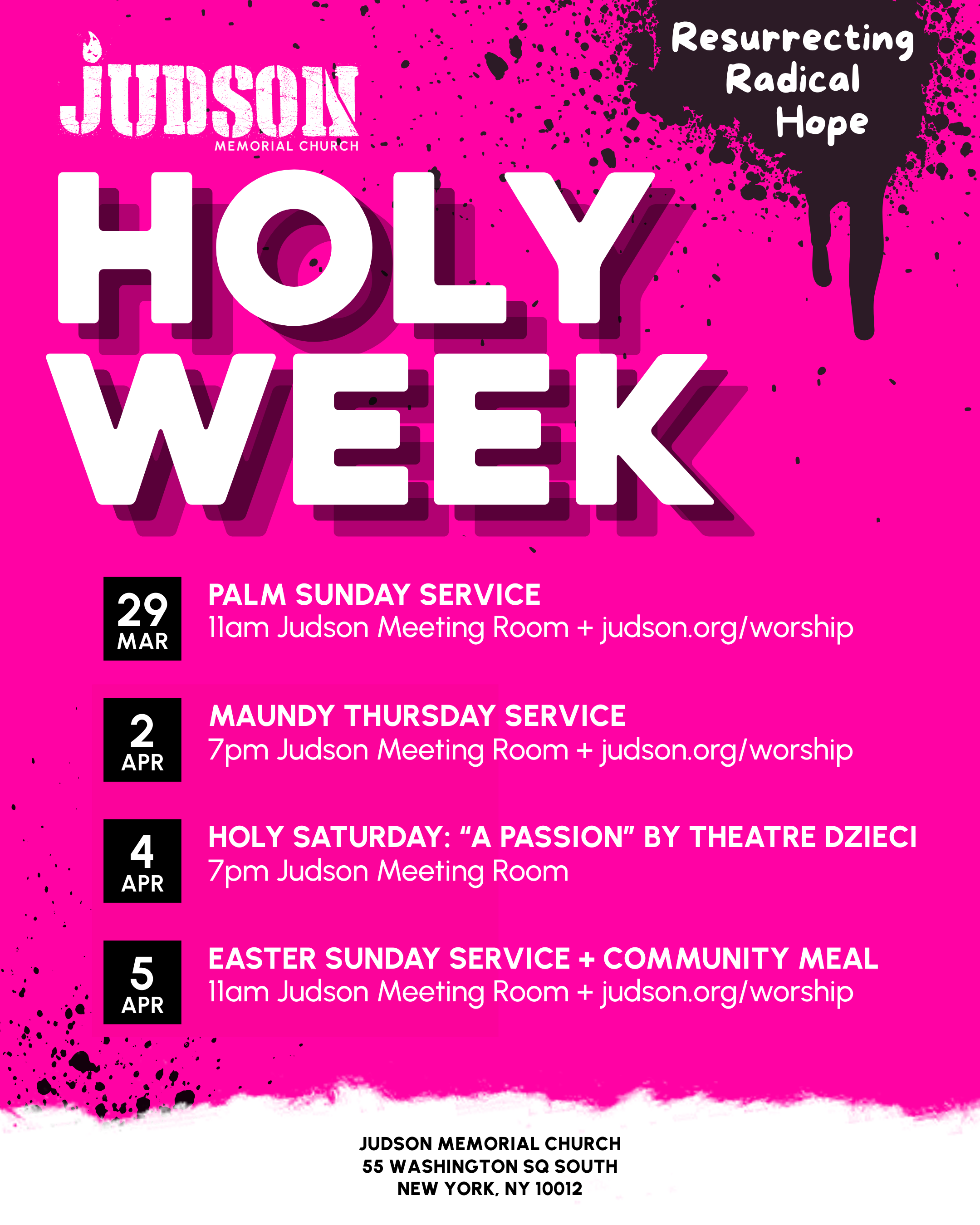 Journey through Holy Week with the Judson community as we acknowledge the ways that Empire violence still threatens us all and recommit to embodying the radically hopeful, persistent resistance that is our continuing call to collective resurrection and liberation.
