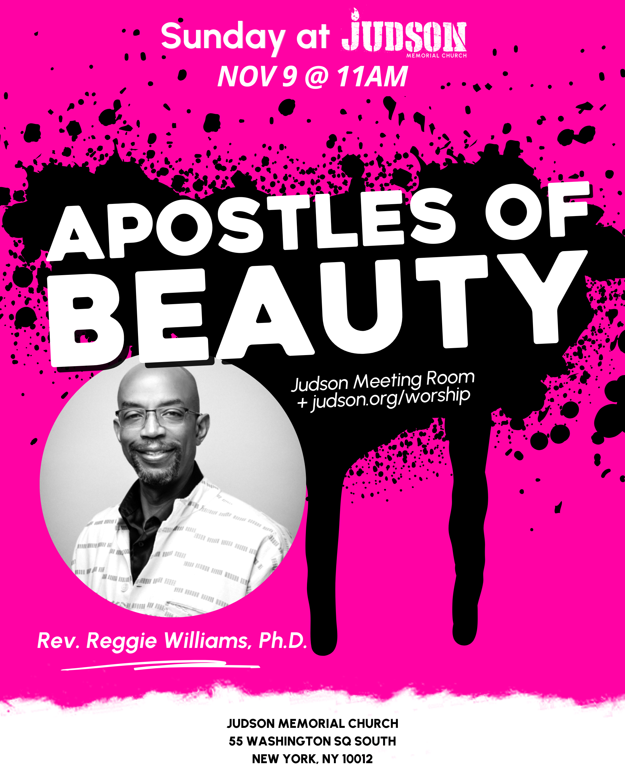 As we prepare for the opening of The 55th Anniversary People's Flag Show in Judson's Gym, we'll be visited by friend of the congregation and powerhouse thelogian and preacher Rev. Reggie Williams, Ph.D. as he brings us reflections on "Apostles of Beauty." As Toni Cade Bambara says, "The role of the artist is to make the revolution irresistible." What are our artists calling us toward right now and what are we all called to co-create?