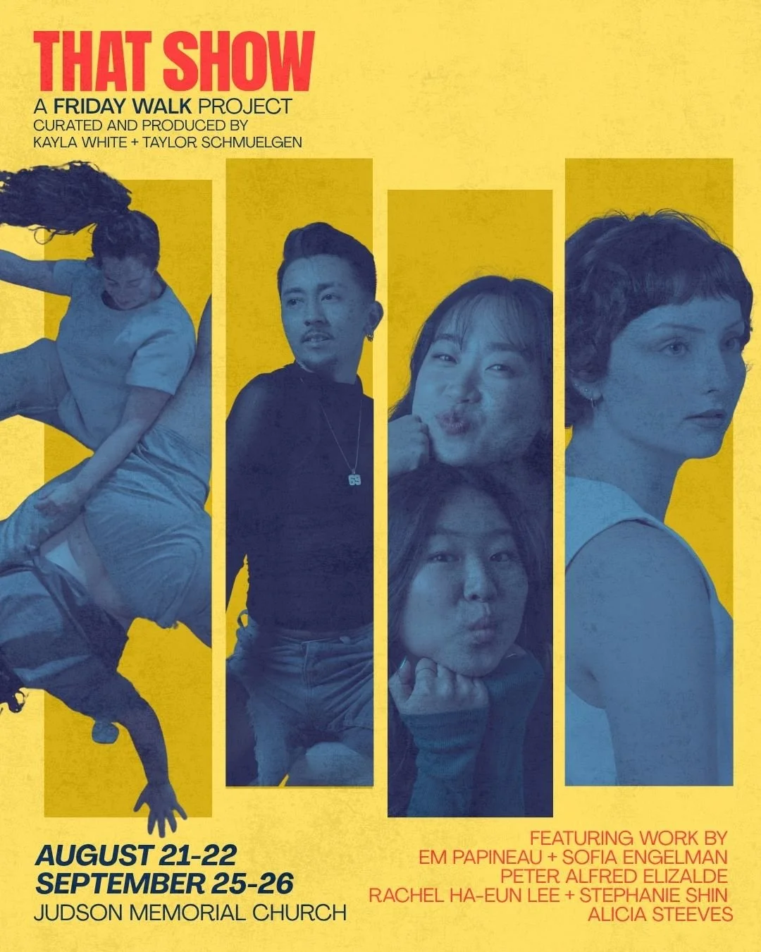 THAT SHOW is a community gathering and showcase of early career performance artists. The evening is meant to build community within and beyond the New York City performance art scene— connecting movement, sound, and theater artists to each other and their audiences. We embrace a messy, do-it-yourself, community centered model. For THAT SHOW (long form) you'll see two longer works split by an intermission and followed by a curated conversation led by Hannah Lieberman on Thursday and a DJ set and after-party ft. Peet the Scholar on Friday!